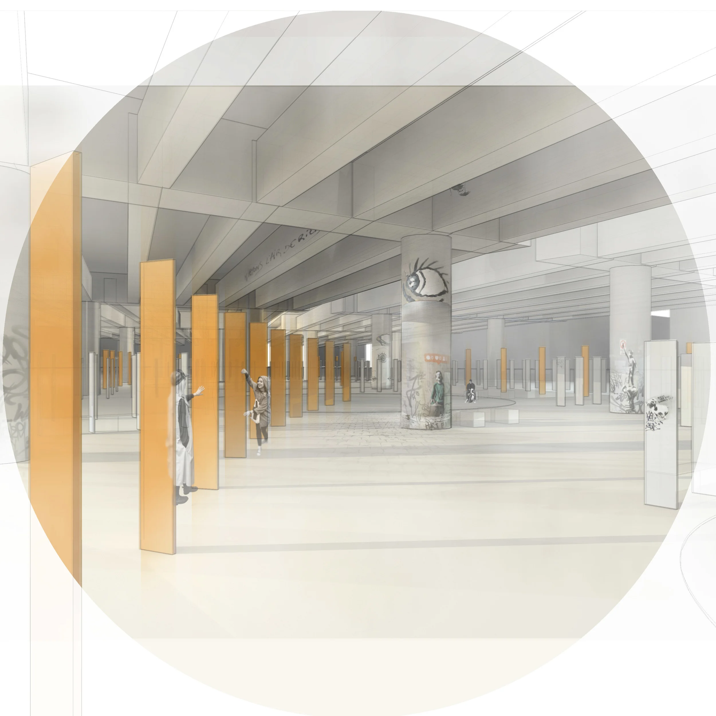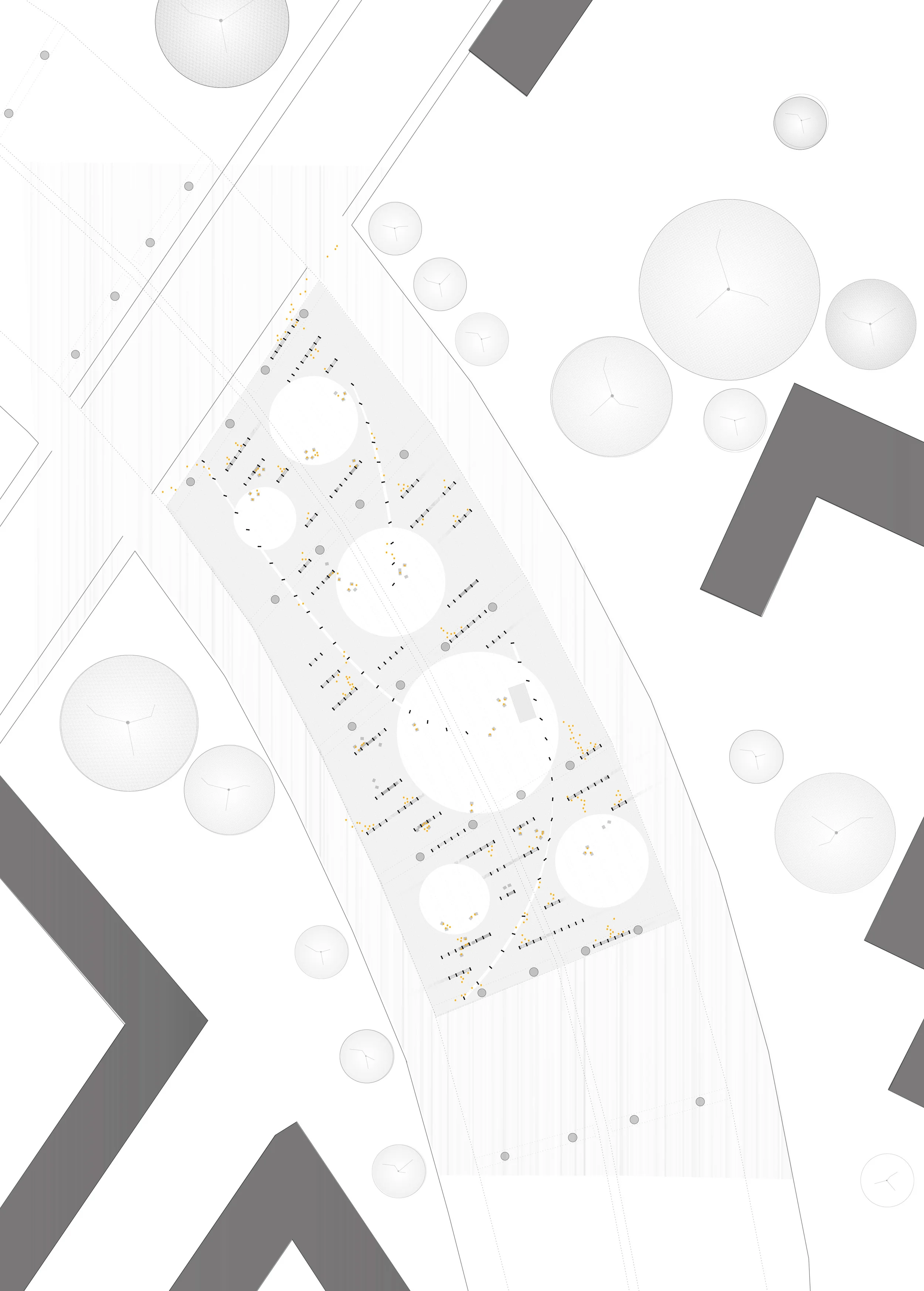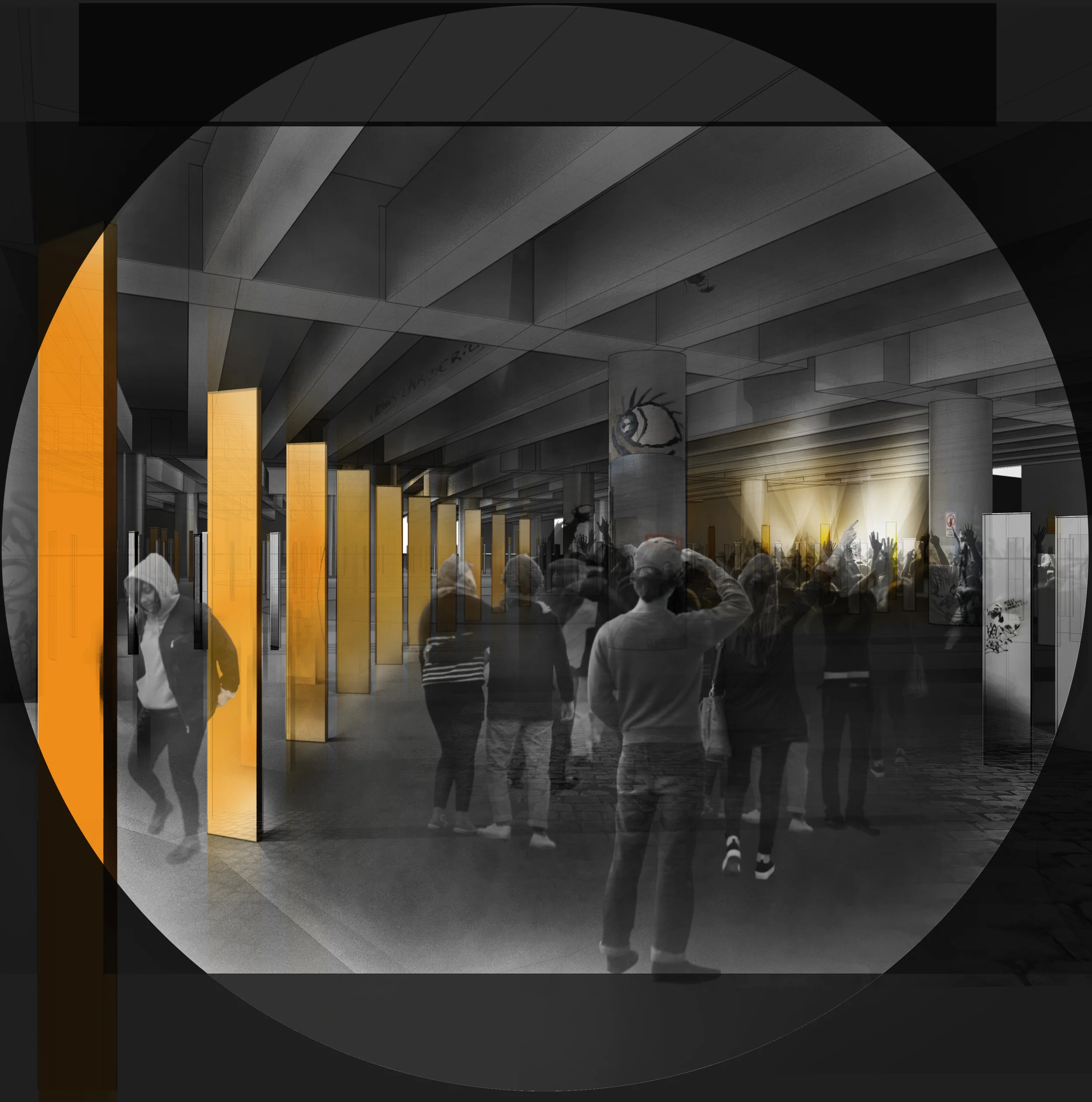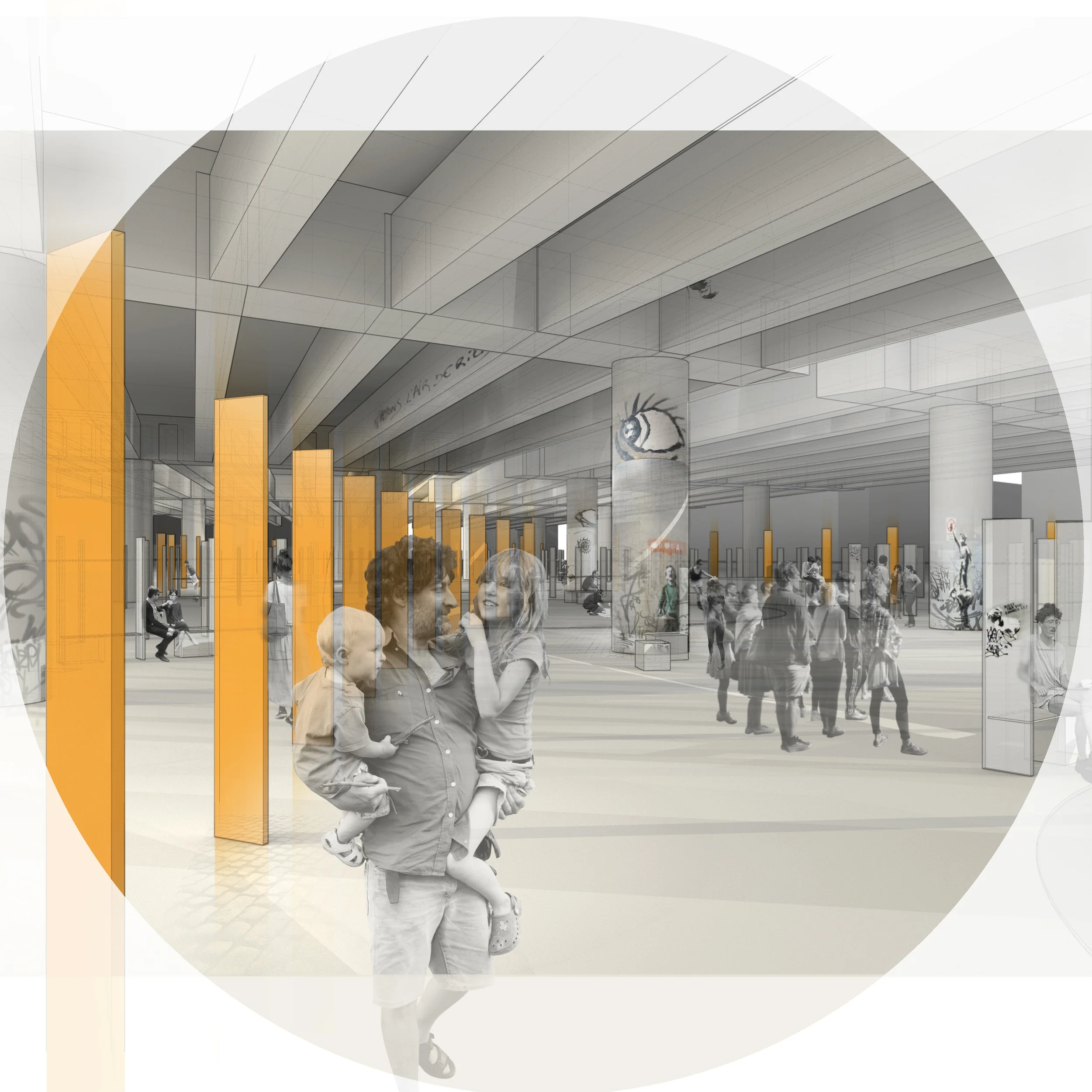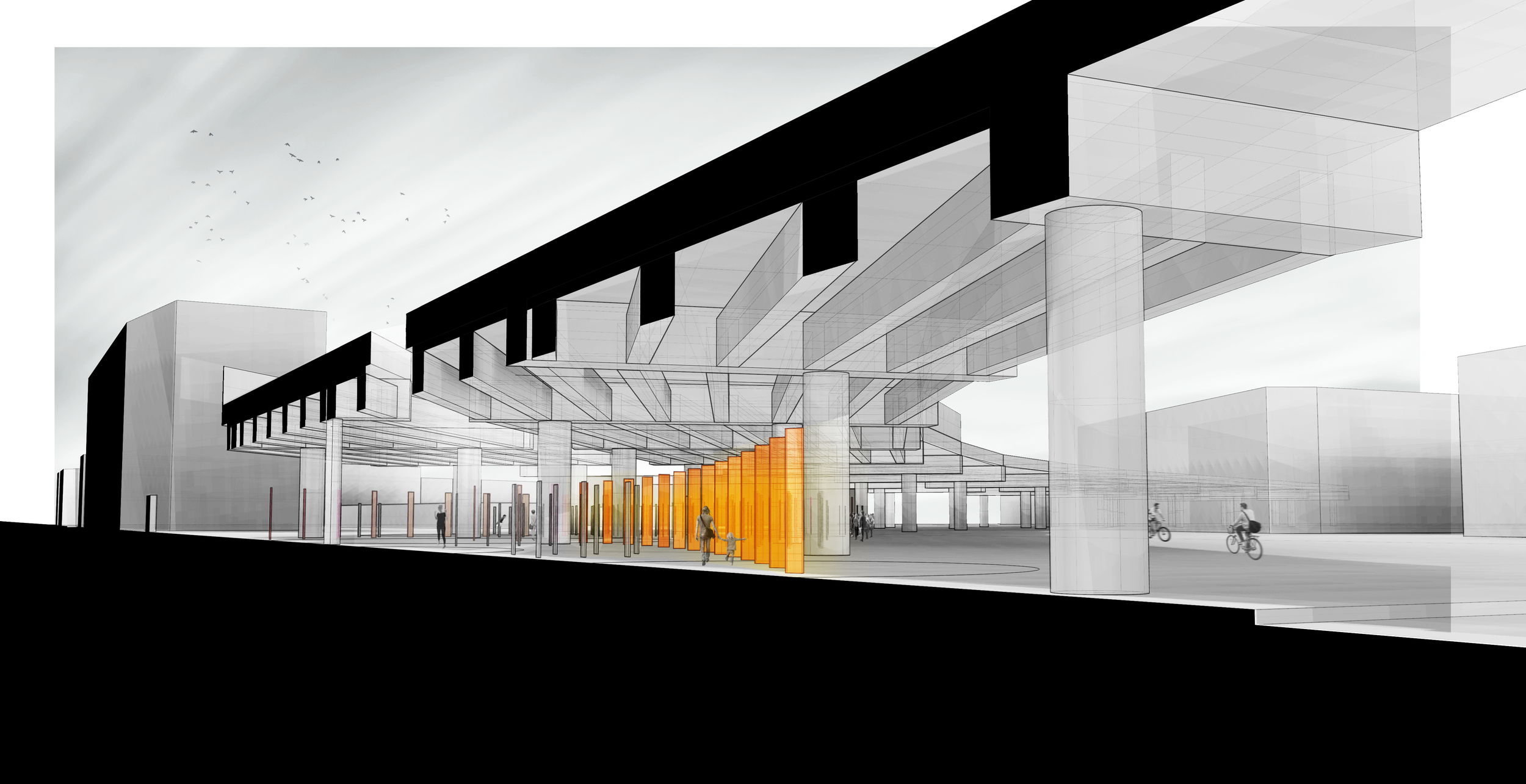 A repetitive modular system of multifunctional panels allows for the transformation of underutilized urban sites. Through simple user interaction, the project can adapt to varying degrees of programming. In its current location under the Bispeengbuen Highway, Delineation services both Nørrebro and Frederiksberg as a gallery for local artists, a social gathering space, a marketplace, and a concert venue.