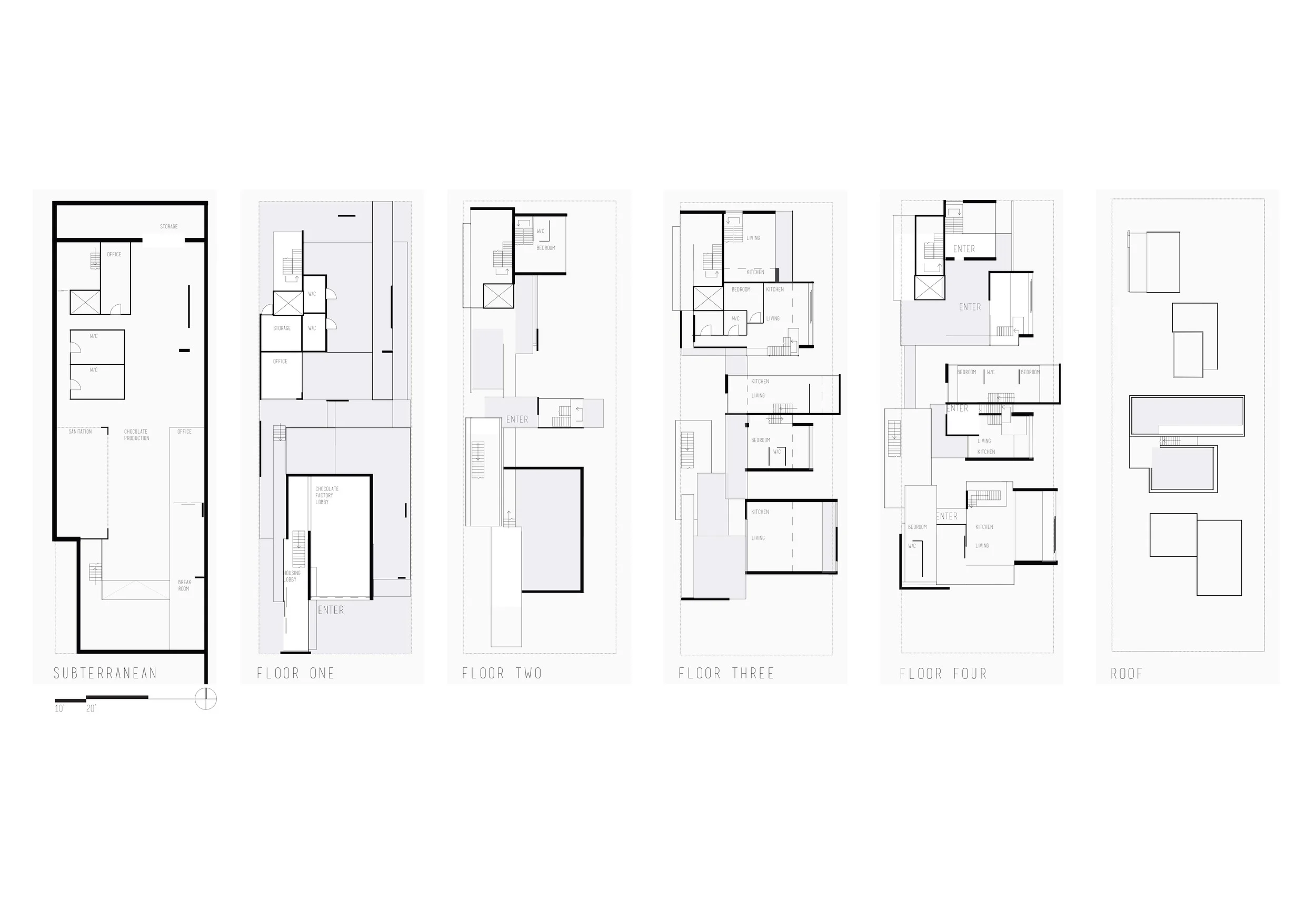 Located in San Francisco's Hayes Valley, Drift is a mixed use project including a subterranean chocolate factory, beer garden, and upper level housing units. This project is an exploration of the potential relationships between various user groups and unique experiences available throughout a complex. The incorporation of exterior spaces link the distinct programs serving as both common ground for living and a source of specialized experience for the community.