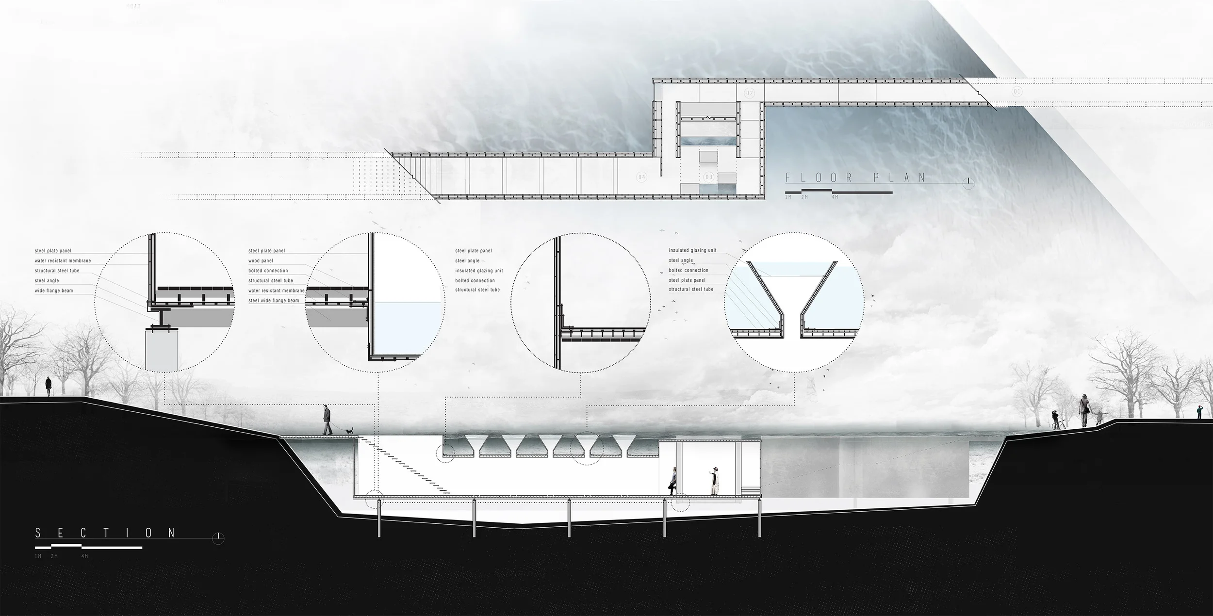 Interlude is a node along a processional pathway connecting greater Copenhagen to the parks and nature found within Kastellet. A period of pause, the pavilion serves as a layered compression zone for users and provides a moment of silence between the chaos of the city and the peaceful nature of the site.